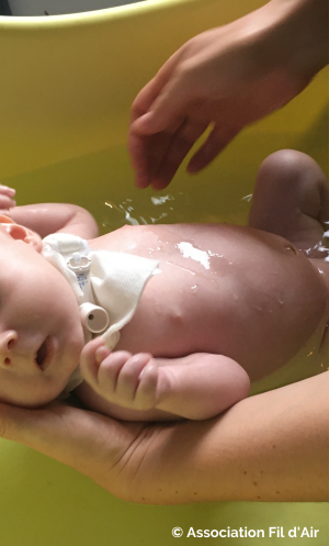 Par ailleurs, le grand ennemi de la trach est l’air sec. Car si les sécrétions sèchent dans la canule, qui fait 3 à 4 mm de diamètre pour les tout petits, alors cette dernière se bouche immanquablement. Les pièces de vie doivent être humidifiées en permanence. Nous avons donc investi dans des humidificateurs d’ambiance à grande capacité. Notre fils, jusque ses 12 mois, dormait (siestes et nuit) avec un masque positionné sur la trachéotomie relié à un système d’humidification. Depuis, nous avons installé un humidificateur médical pour qu’il soit plus libre de ses mouvements.